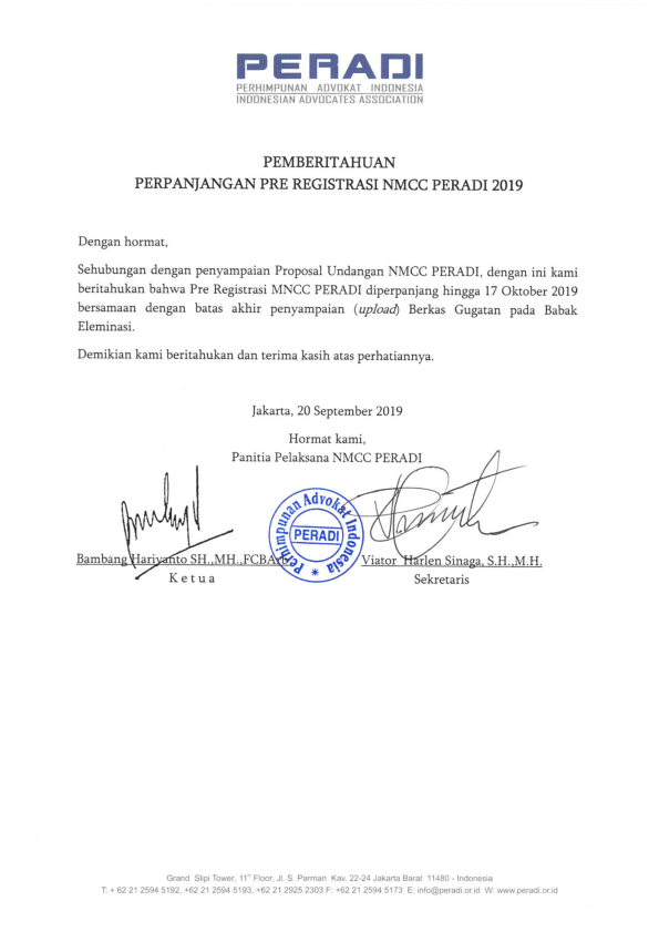 PEMBERITAHUAN PERPANJANGAN PRE REGISTRASI NMCC PERADI 2019