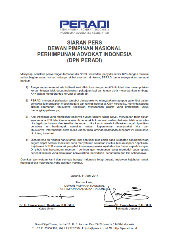 Siaran Pers Dewan Pimpinan Nasional Perhimpunan Advokat Indonesia (DPN PERADI)