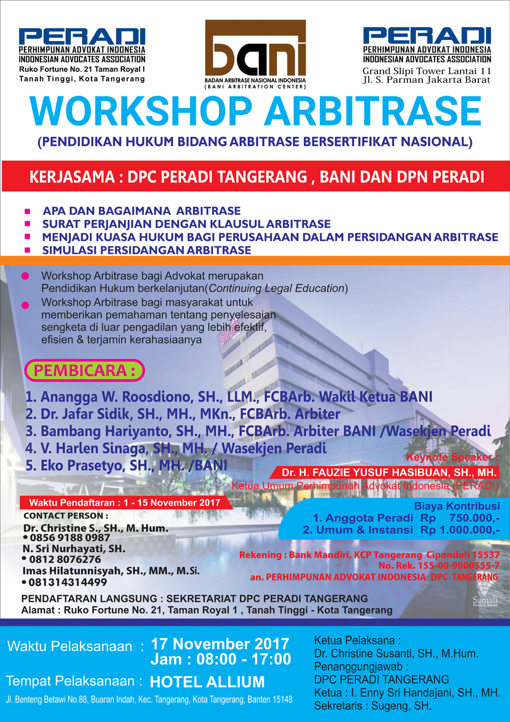 WORKSHOP ARBITRASE (PENDIDIKAN HUKUM BIDANG ARBITRASE BERSERTIFIKAT NASIONAL) KERJASAMA : DPC PERADI TANGERANG, BANI & DPN PERADI